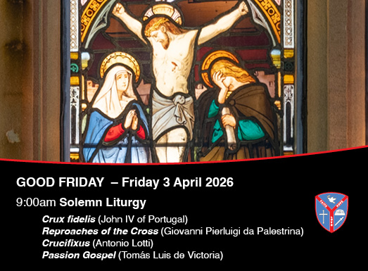 3 April – Good Friday Apr3Good FridayWhen:Apr 3, 2026 9:00 am Solemn Liturgy Motet: Crux fidelis (John IV of Portugal)Motet: Reproaches of the Cross (G.P. da Palestrina)Motet: Crucifixus á8 (Antonio Lotti)Passion Gospel (T.L. da Victoria)